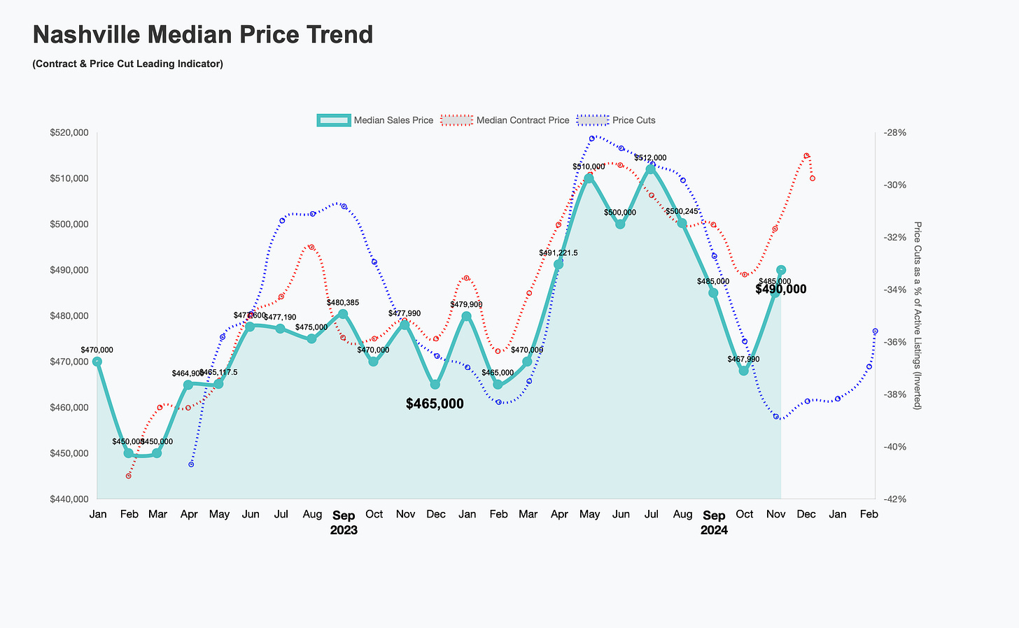 Down ~2% from 2022 peak of $500K (May 2022)