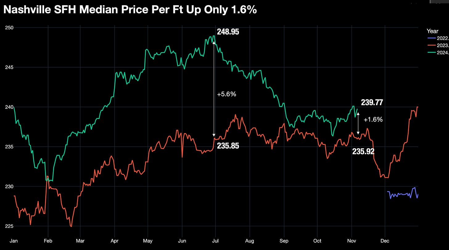 One possible reason is mix. We can see this by considering Median Price Per Ft vs just Median Sales Price. We get only 1.6% increase. This seems more reasonable as we are seeing some wild swings in price point and location. Demand is up 37.5% for Williamson County where 2,000 million dollar homes will be sold this year. While all of middle Tn is up only 13%.