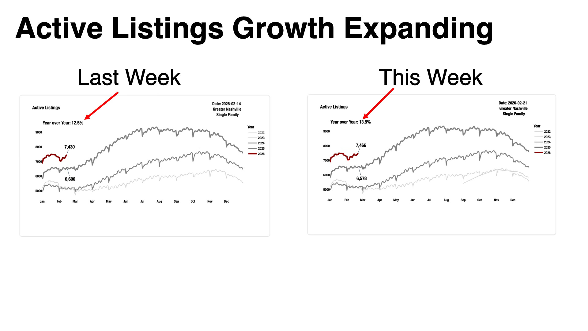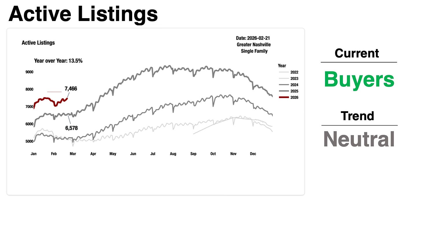 7,466 active single-family listings in Greater Nashville. Up 13.5% from 6,578 at this point last year. Last week that gap was 12.5%.