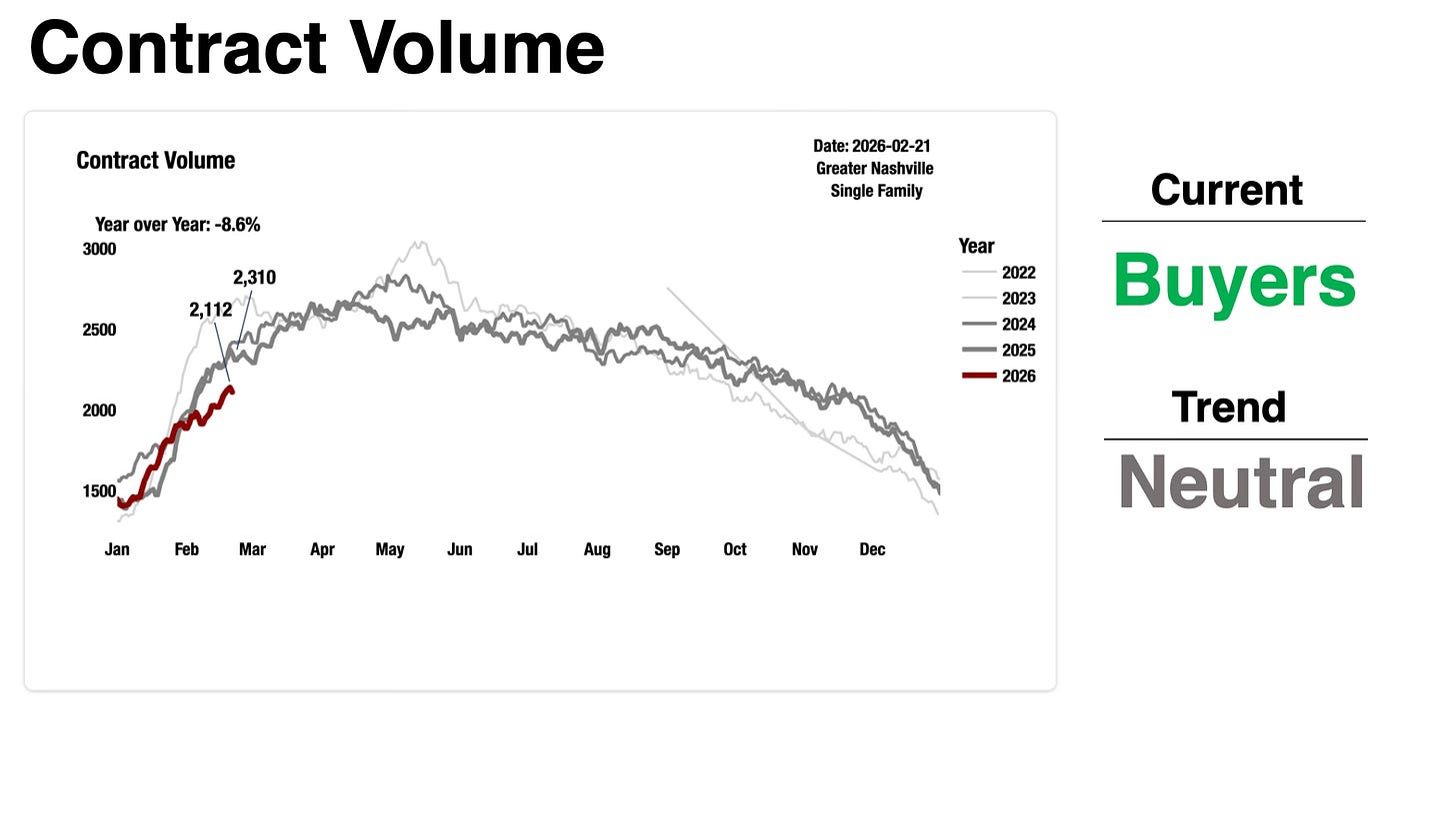 The growth rate isn’t just elevated. The spread between this year and last year got wider, not narrower. Is that going to continue? If 2026 inventory breaks above the January highs before month end, that would be a counter-trend to what we saw in ‘23 and ‘24, and I’d reclassify this from Neutral to a full Buyer trend. We’re not there yet. But we’re getting closer.