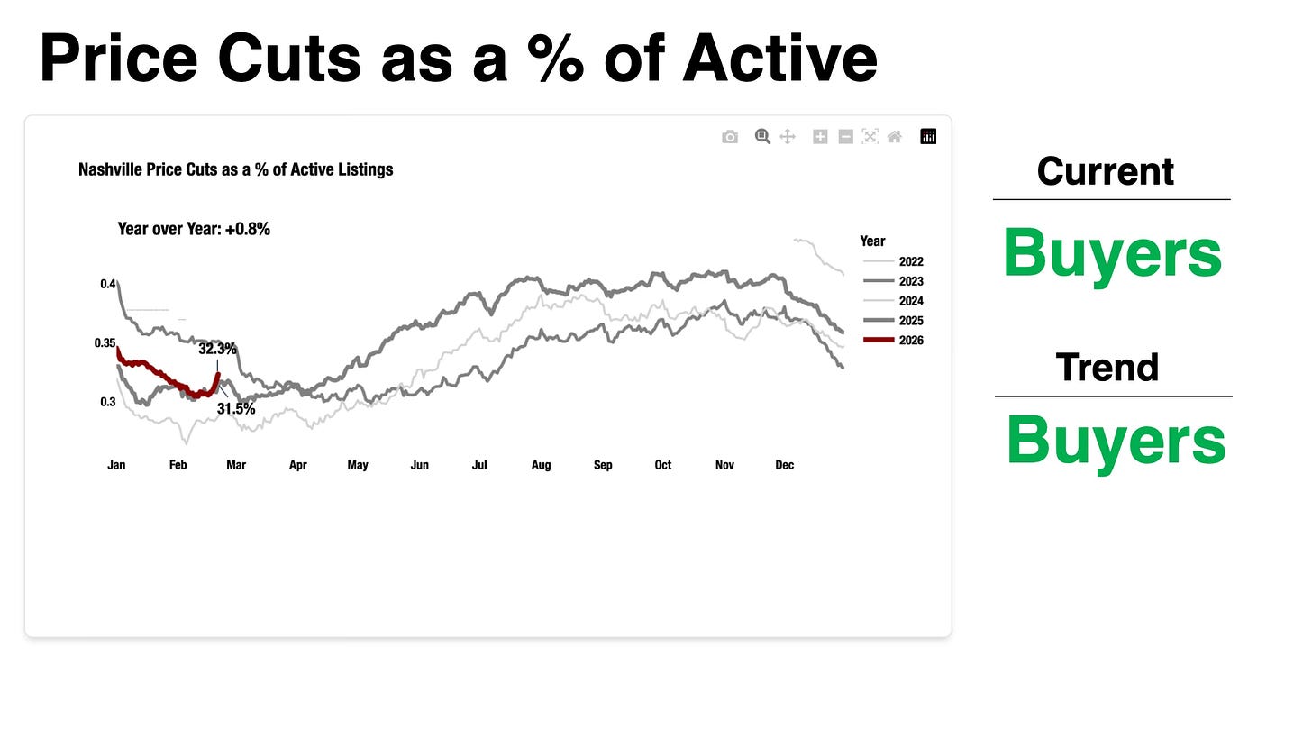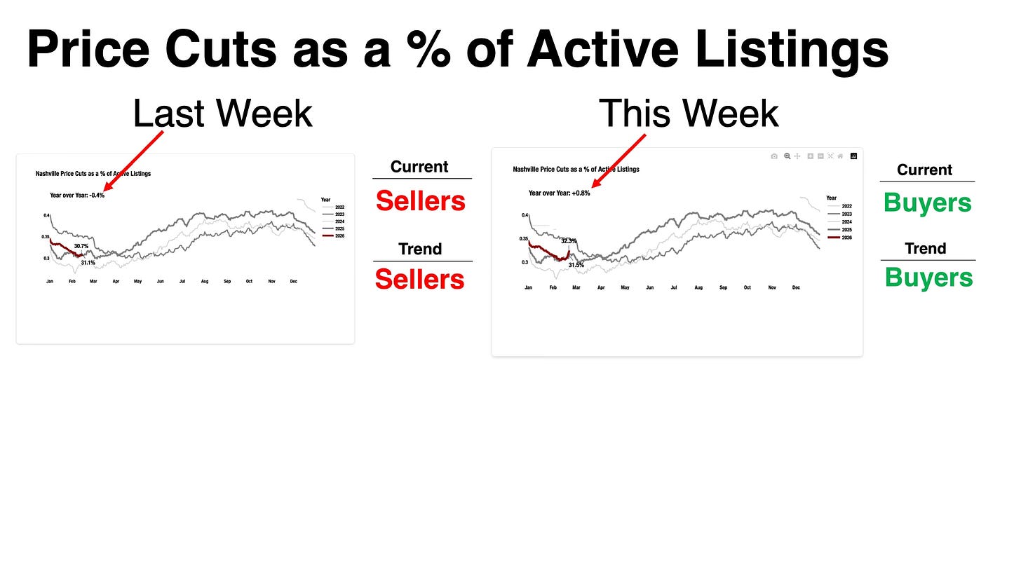 If you follow these weekly updates, you know I track three core metrics: active listings, contract volume, and price cuts as a percentage of active listings. That third one was solidly bullish for sellers last week.