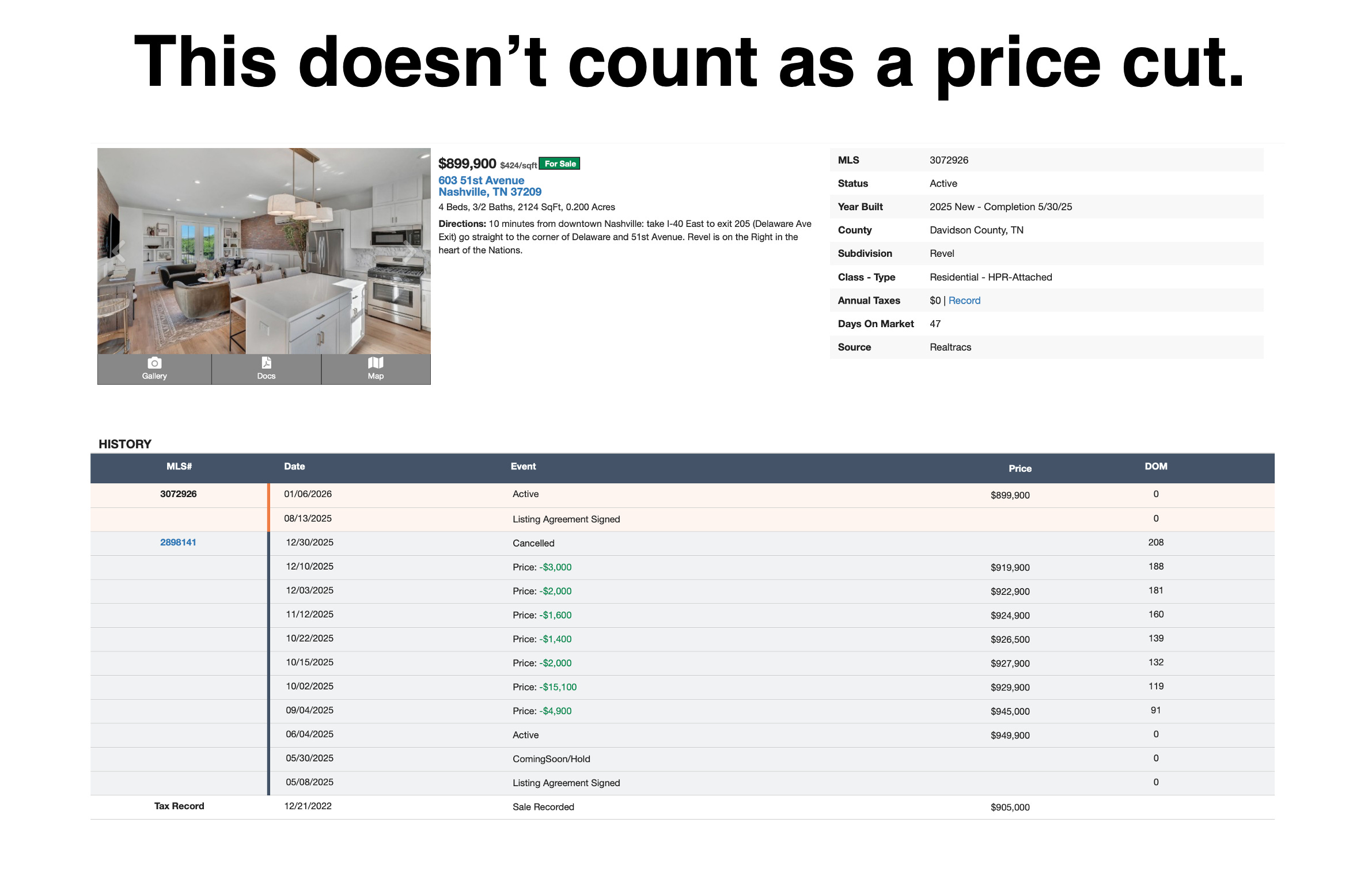 When a seller pulls their listing after months of sitting and re-lists under a new MLS ID at a lower price, that doesn’t register as a price cut. Take 603 51st Avenue, on the market since May 2025, dropped from $950K to $900K across two listings. Invisible in this ratio. How many more are out there like that?